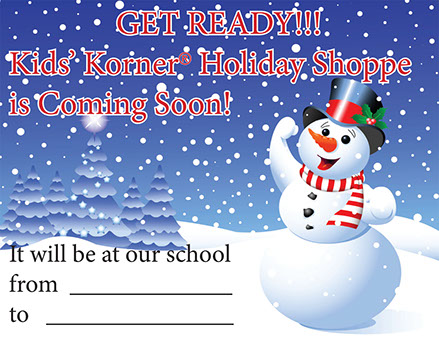 A large 3' x 5' Cloth Kids' Korner® Banner to hang outside advertising that your Holiday Shop will be at your school soon.