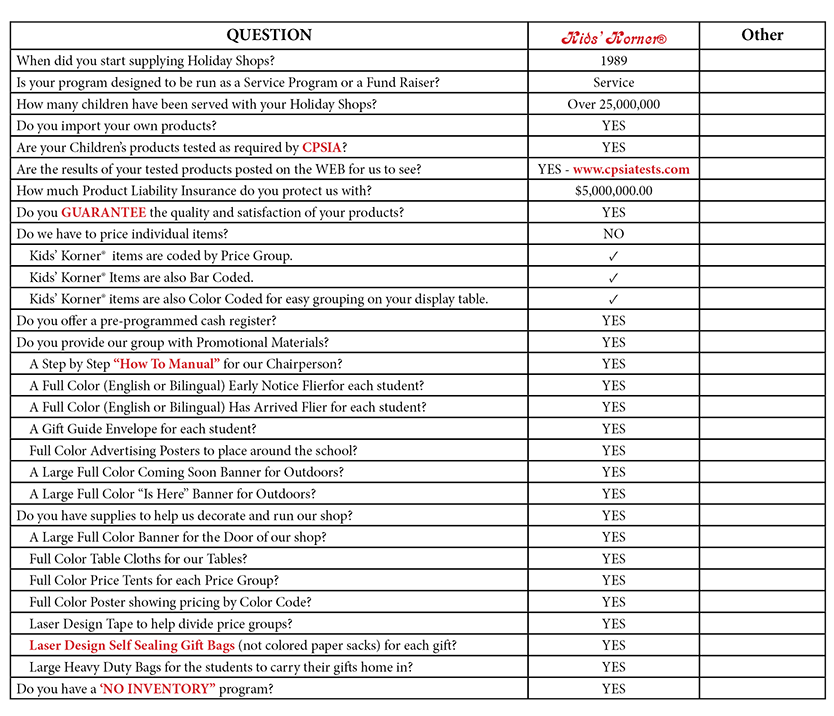 If so, please print out the form below and compare us to the competition.   We, at Kids' Korner®, believe you will not find any supplier who offers you better quality, better prices, better service, or as many marketing aids as we do.  We have spent almost 30 years making sure you and your kids' receive the very best.  Plus, we have over 60 local independent family owned distributors available to help you.